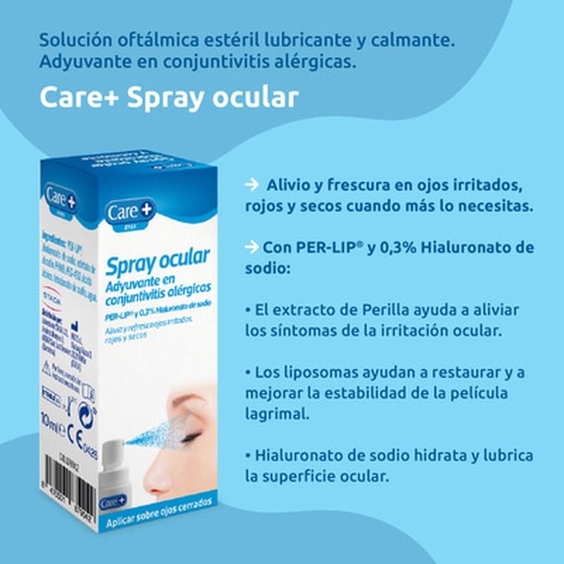 O spray oftálmico Care+ restaura a homeostase da superfície ocular e do filme lacrimal, alterados por alérgenos, poeira, exposição ao vento ou poluição. Estresse ambiental, como ar condicionado ou fadiga ocular devido ao uso prolongado de lentes de contato, computadores e condições adversas de iluminação, etc.